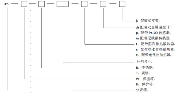 ?、?配給1支連接撓性管接頭,方便撓性管連接及密封(防爆工況嚴(yán)禁使用)。 ?、?依據(jù)用戶提供的位號(hào)參數(shù)配給1支150×50×1mm不銹鋼位號(hào)牌。 規(guī)格型號(hào)及定義